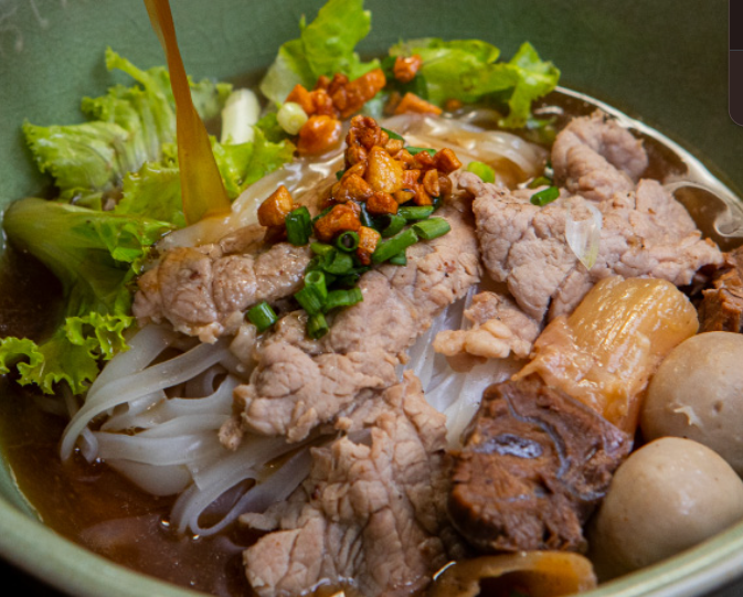 Rice Noodles, pork loin, or flank steak, and meatballs in Thai-style broth. Garnished with garlic oil, salted radish, green onion and cilantro. Refreshing flavor.